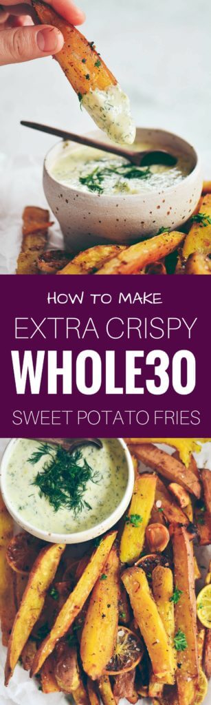 “Extra crispy sweet potato fries loaded with fresh lime zest & baked garlic. These delicious whole30 compliant, paleo fries a snacking addiction!”